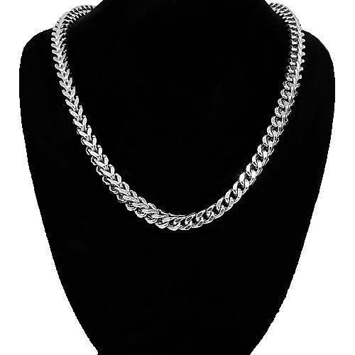 This mens franco chain is handcafted in 14k white gold. Each link features a cut out design which resembles a diamond. The frame measures to 37" in a length and 1/8" in width. Weighing 19 grams, this chain locks with lobster claw clasp.