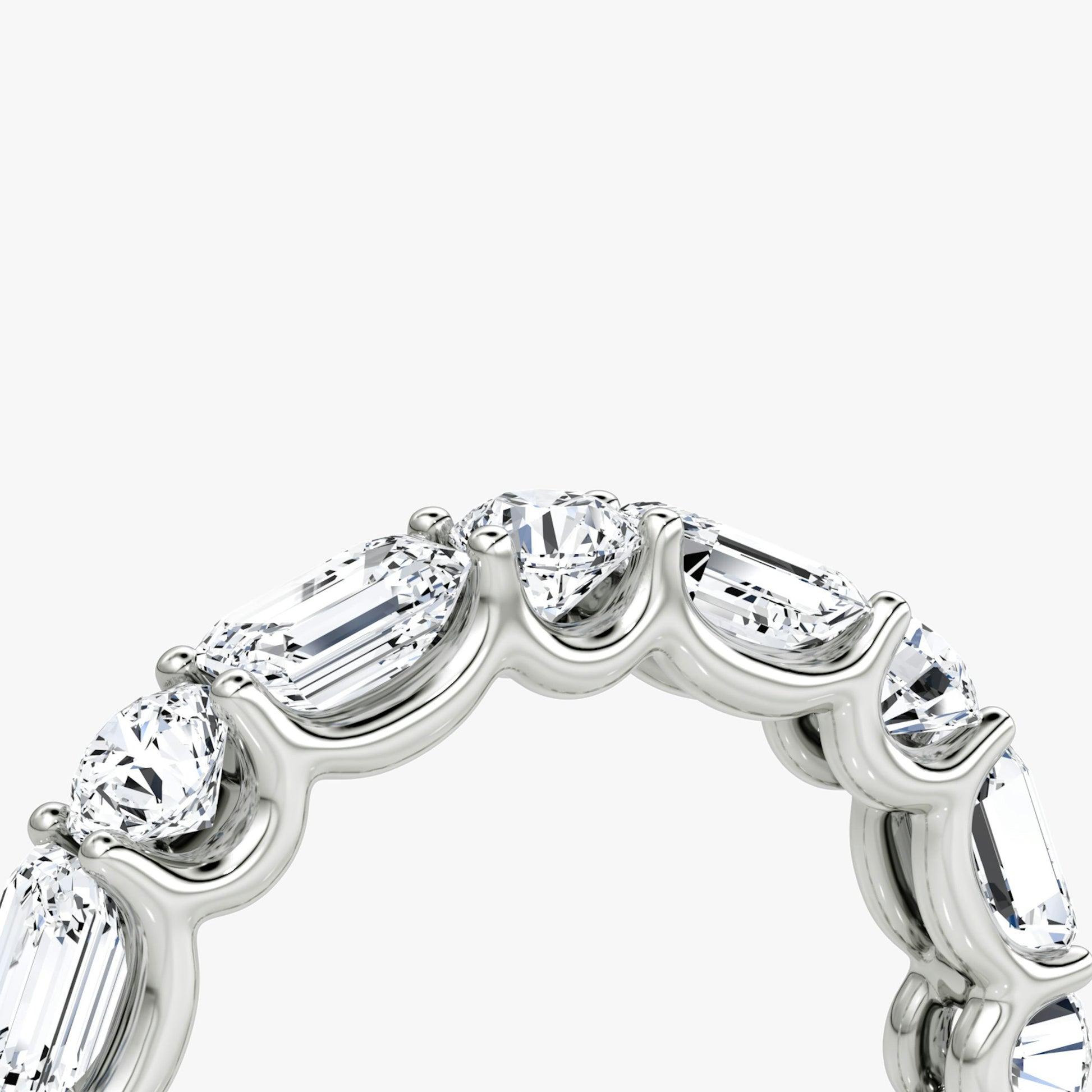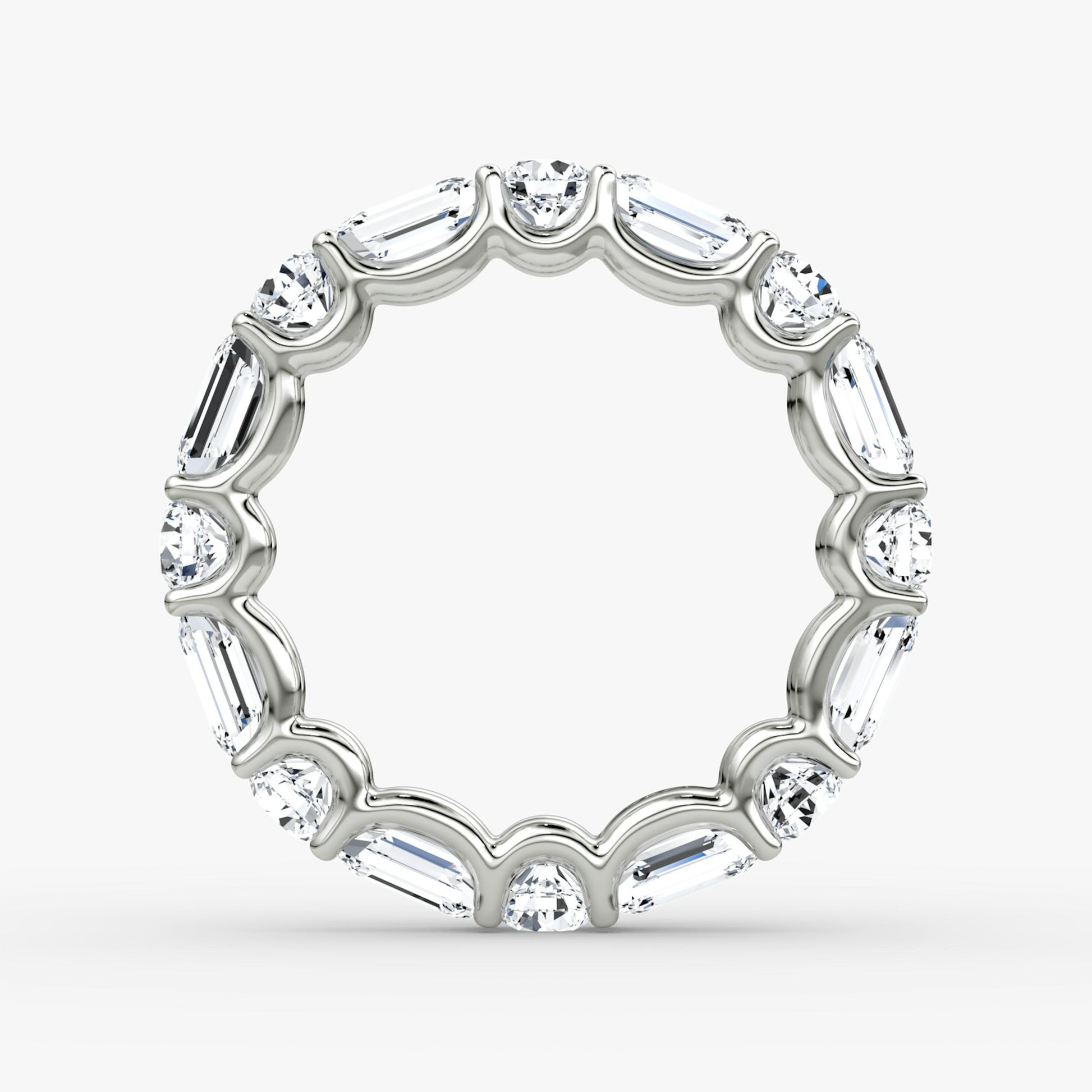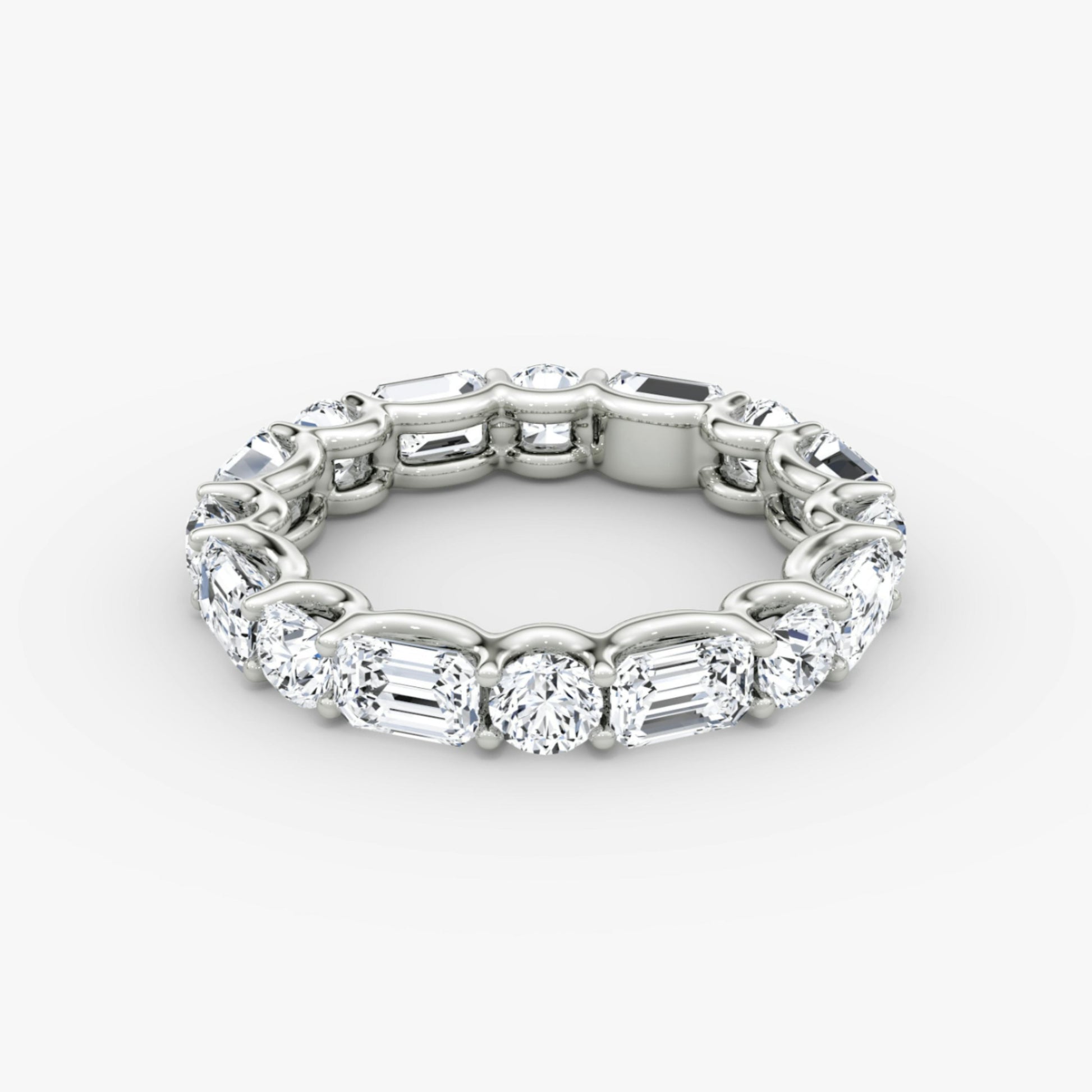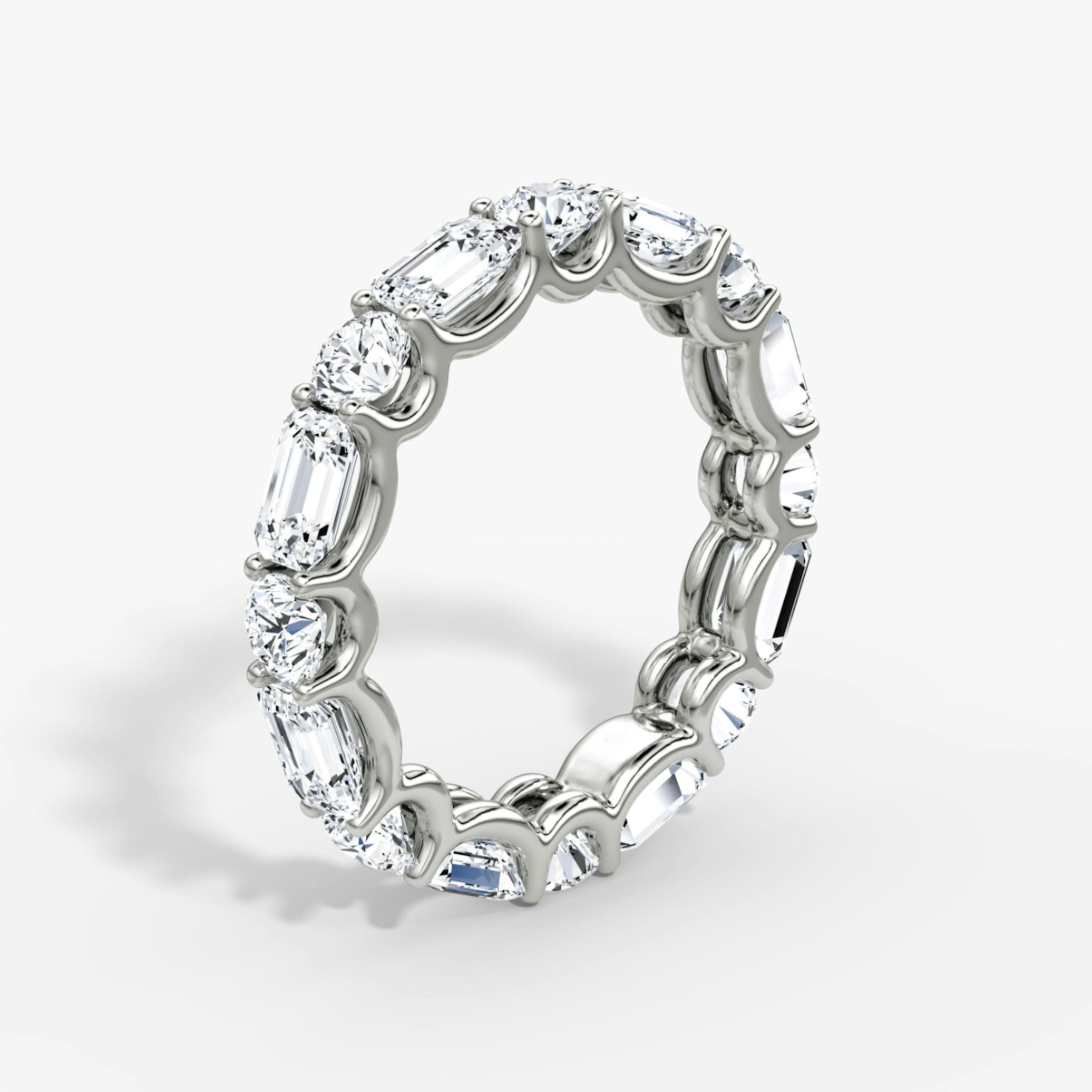 A captivating wedding band features an alternating sequence of Emerald and Round Brilliant cut diamonds, set along a band available in either platinum or gold. This design showcases a striking balance between historical elegance and contemporary style, with diamonds set in a secure prong setting for enhanced brilliance and strength. The Emerald cut diamonds lend a modern touch to the classic design, ensuring a diamond-rich appearance.