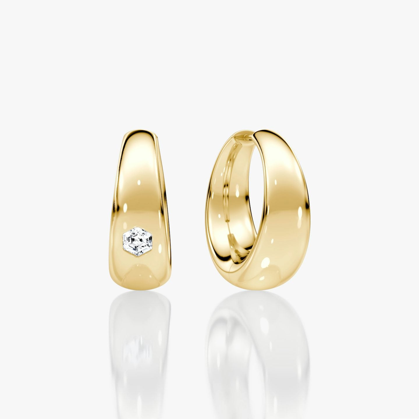 The VVS Dome Hoop offers a modern, California-inspired twist on a captivating design. Each 14k gold hoop features a full band with domed edges and a .25 carat Hexagon VVS diamond, adding vintage flair to any beach or dinner outfit.