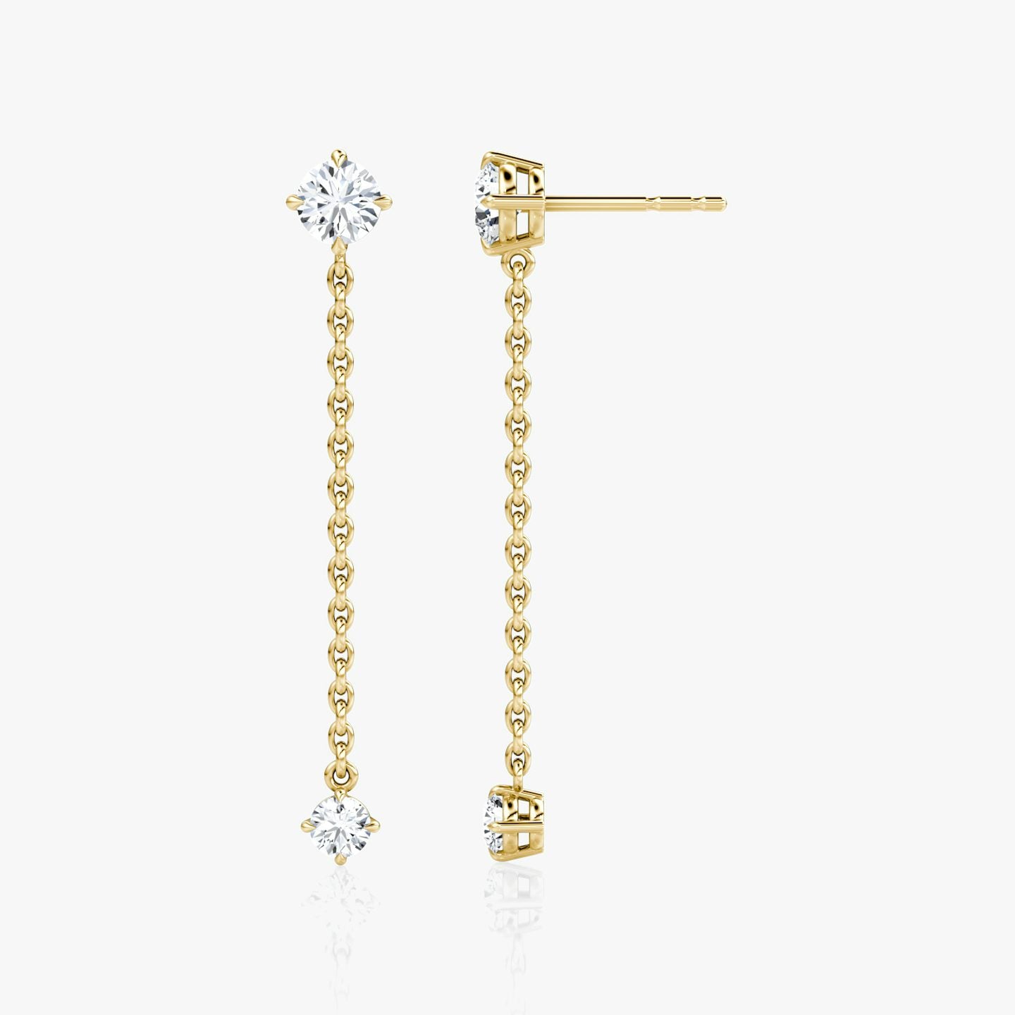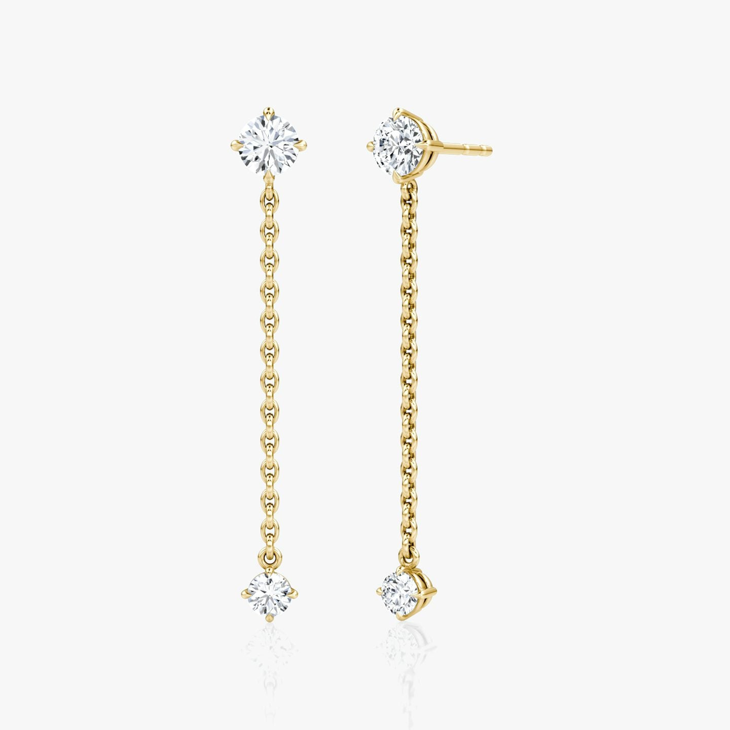 Two round brilliant VVS diamonds are showcased in a modern, elegant setting. Choose a customizable 14k solid yellow or white gold dangling chain for a timeless and sophisticated look, perfect for any special day and beyond.