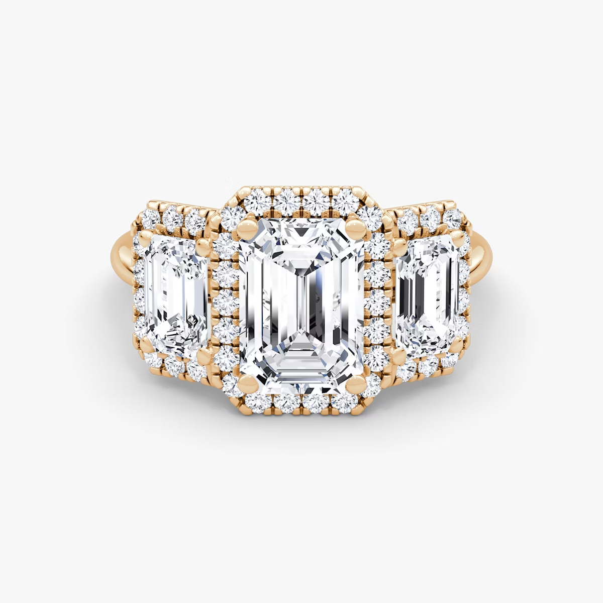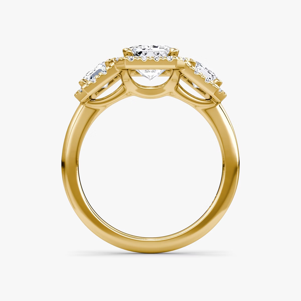 Our Three Stone Halo engagement ring showcases two exquisite side stones that enhance the brilliance of the lab grown center diamond, symbolizing the past, present, and future of your relationship. With the addition of a halo of pavé set diamonds, this setting lets your story shine even brighter.