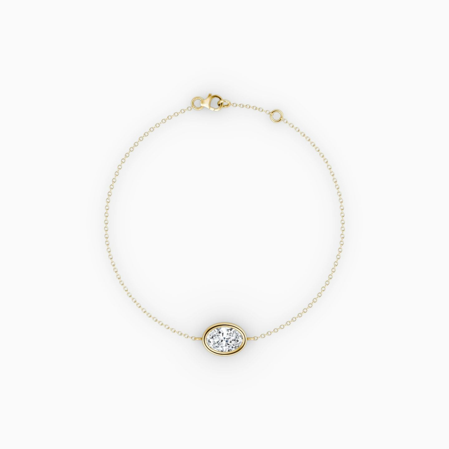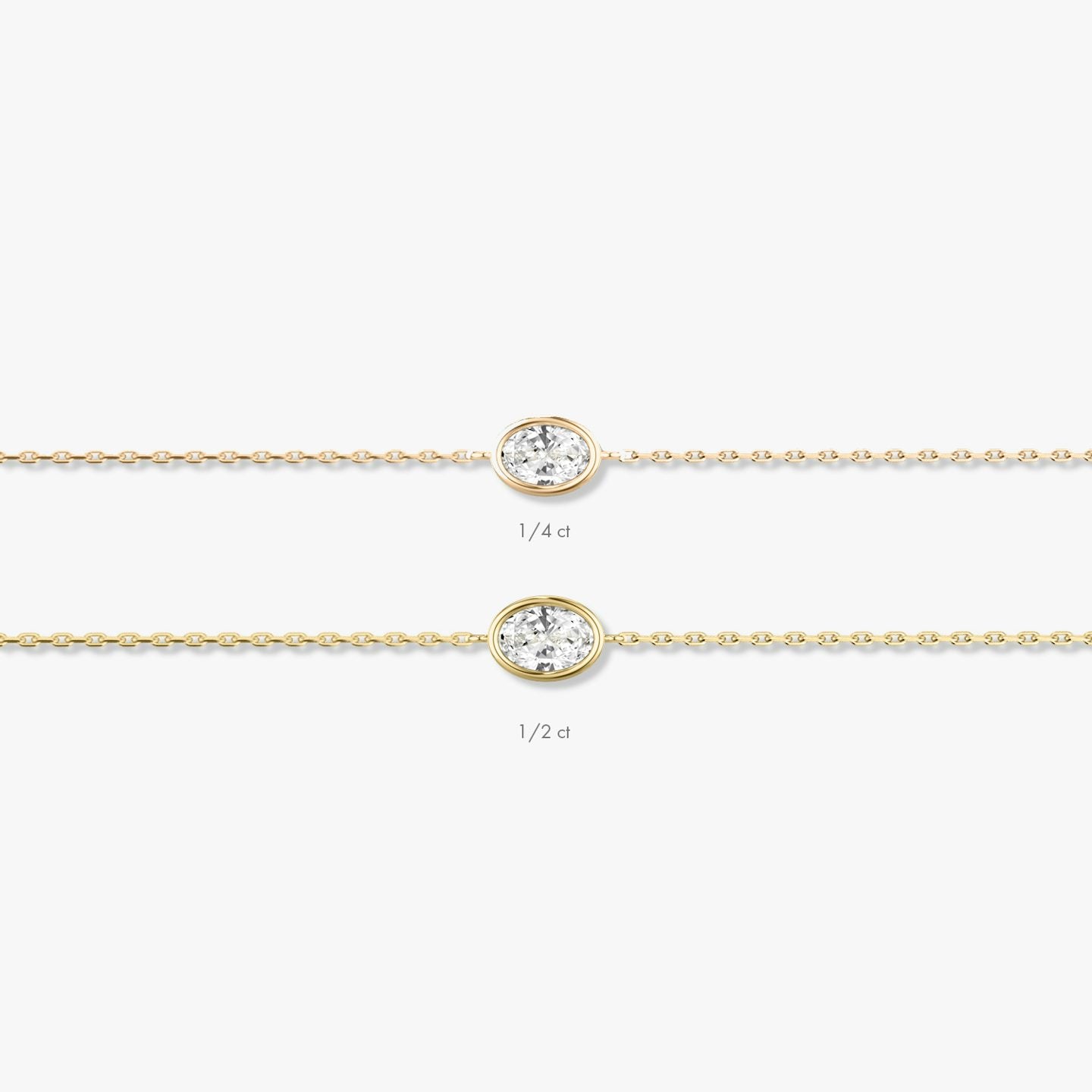 The Bezel Solitaire Bracelet merges vintage-inspired details with modern charm for a look of timeless elegance. Featuring a 14k solid gold or sterling silver bezel setting and matching chain, it highlights the unique form of eight different lab-grown diamond shapes in customizable sizes. This design captures and reflects light beautifully from every angle.
