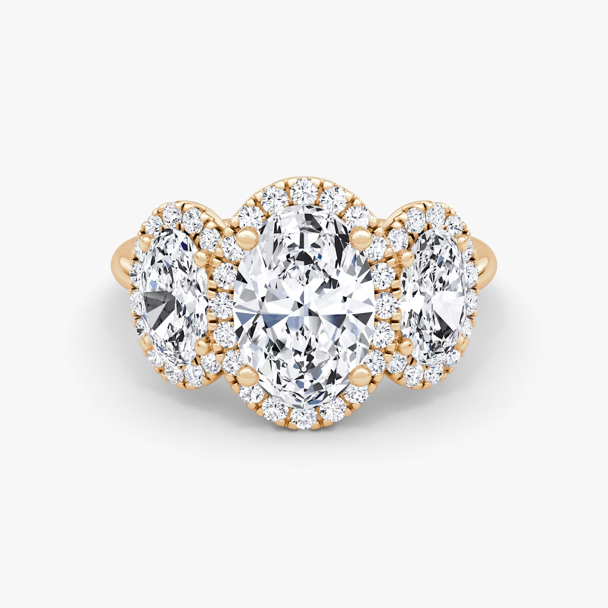 Our Three Stone Halo engagement ring showcases two exquisite side stones that enhance the brilliance of the lab grown center diamond, symbolizing the past, present, and future of your relationship. With the addition of a halo of pavé set diamonds, this setting lets your story shine even brighter.