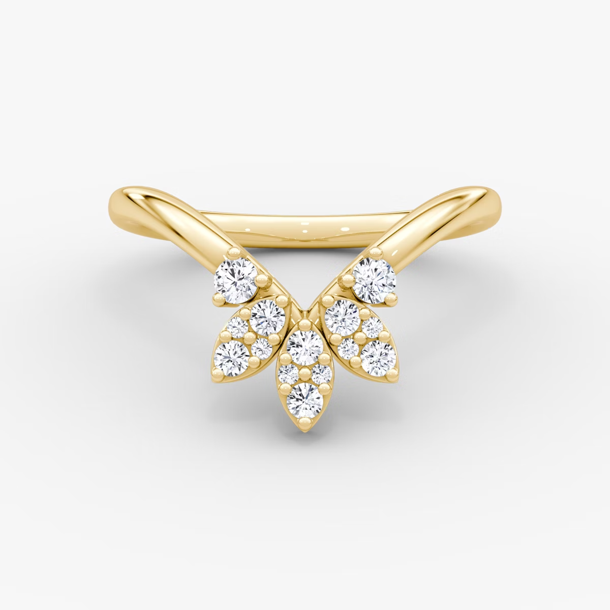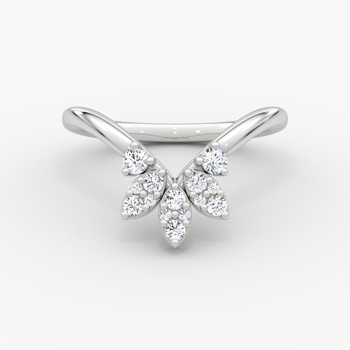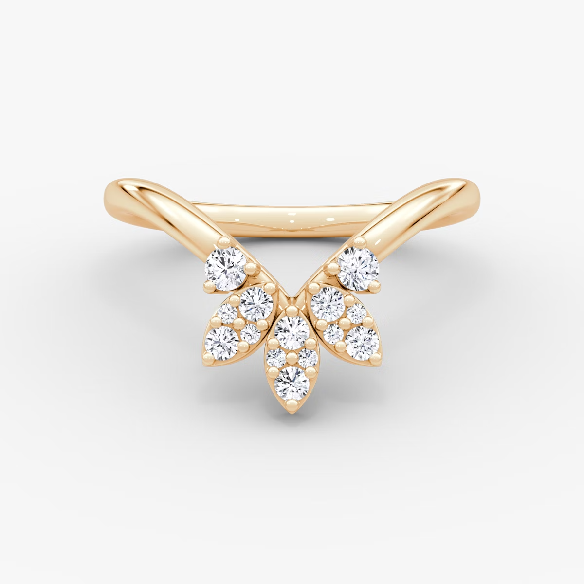 A collection of pavé-set lab grown diamonds embellish the band, creating petal-like formations that gently soften its pronounced point. This piece is designed to either elegantly "crown" your wedding ring ensemble or to be worn individually as a statement piece.