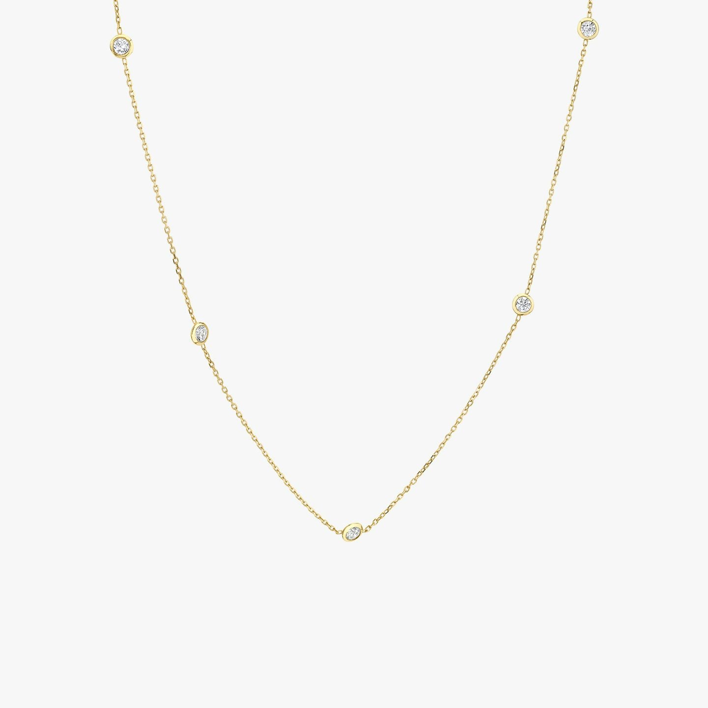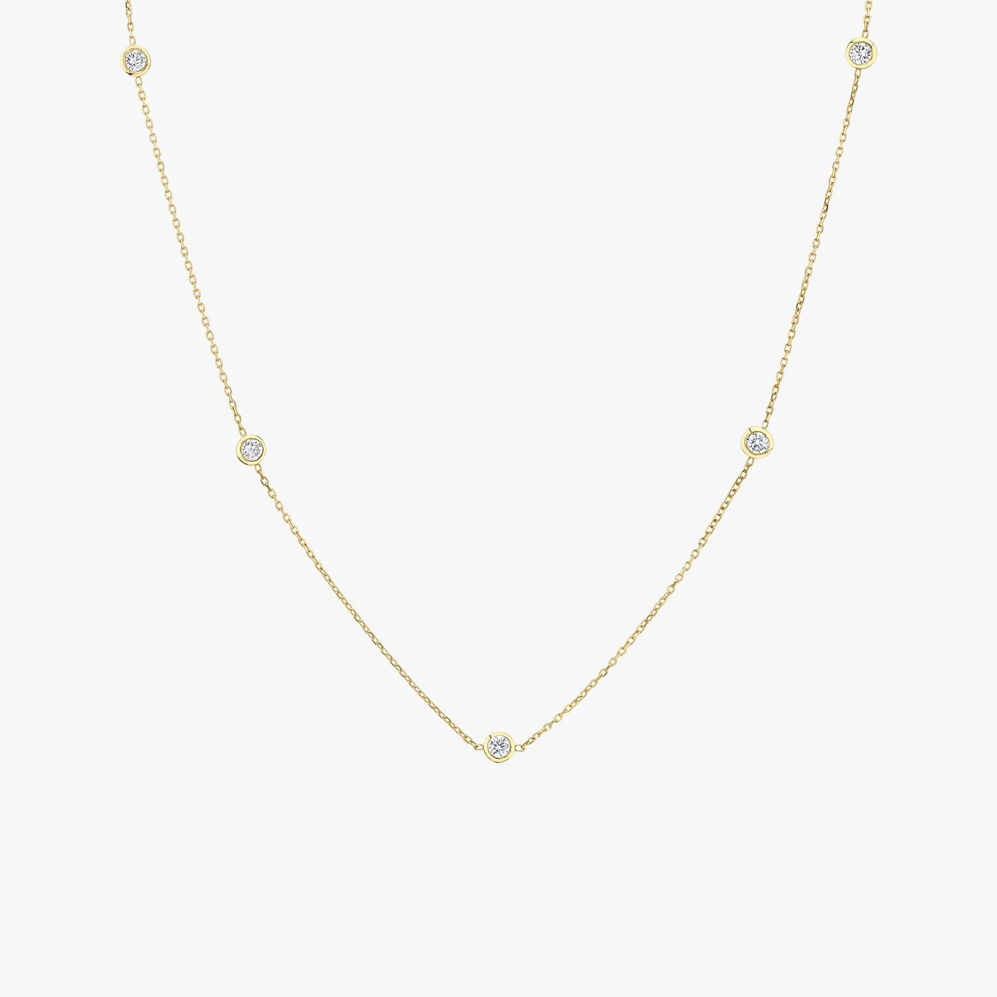 Symmetrical structure, amplified. Our Knife-Edge Bezel Station Necklace boasts five diamonds gracefully outlined in a knife-edge bezel setting. The delicate 14k solid yellow or white gold chain and rim accentuate the shape of each diamond, reflecting light in all directions to ensure they shine as brightly as you.