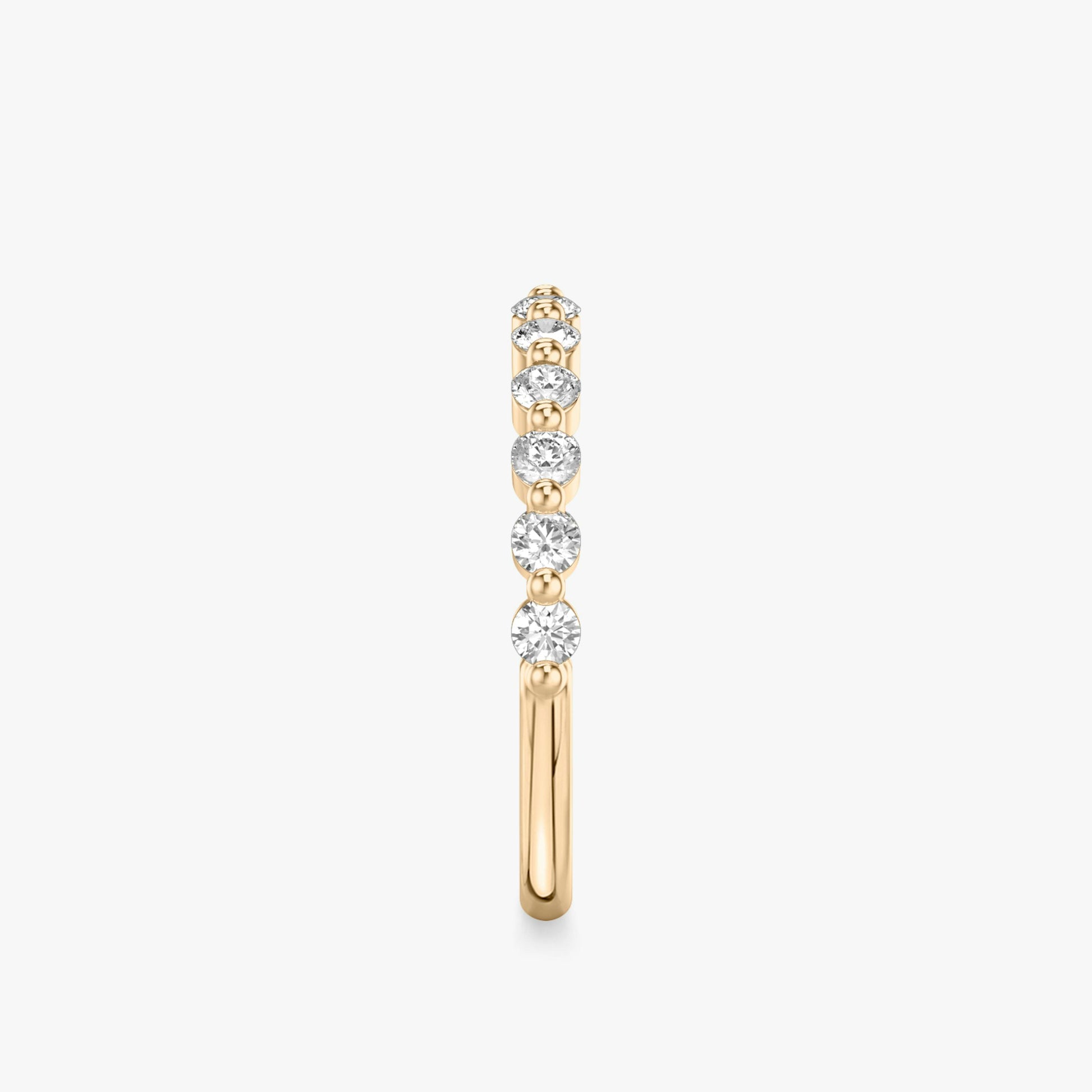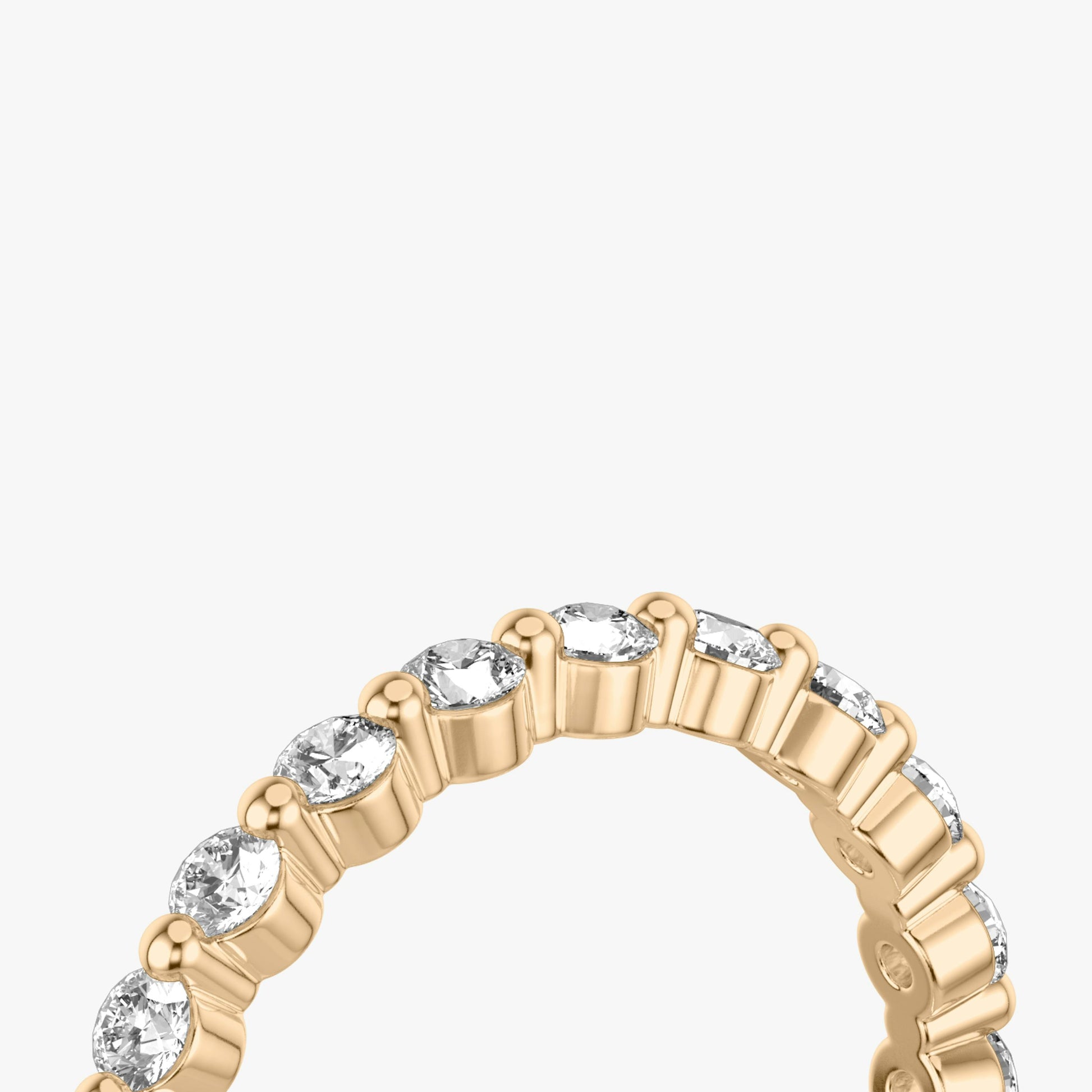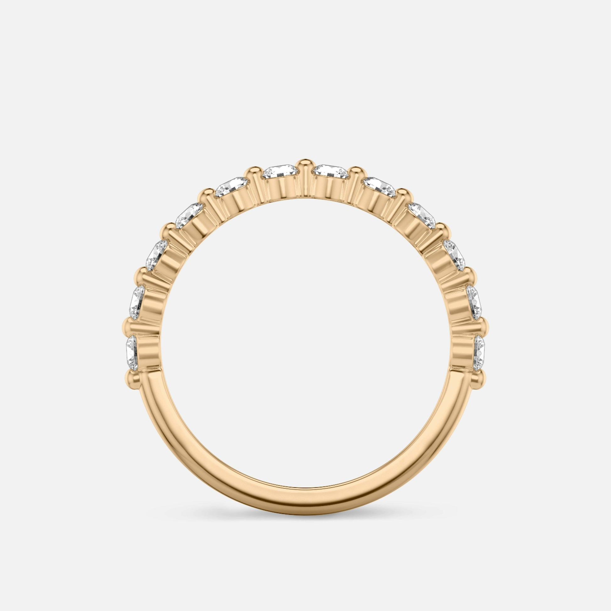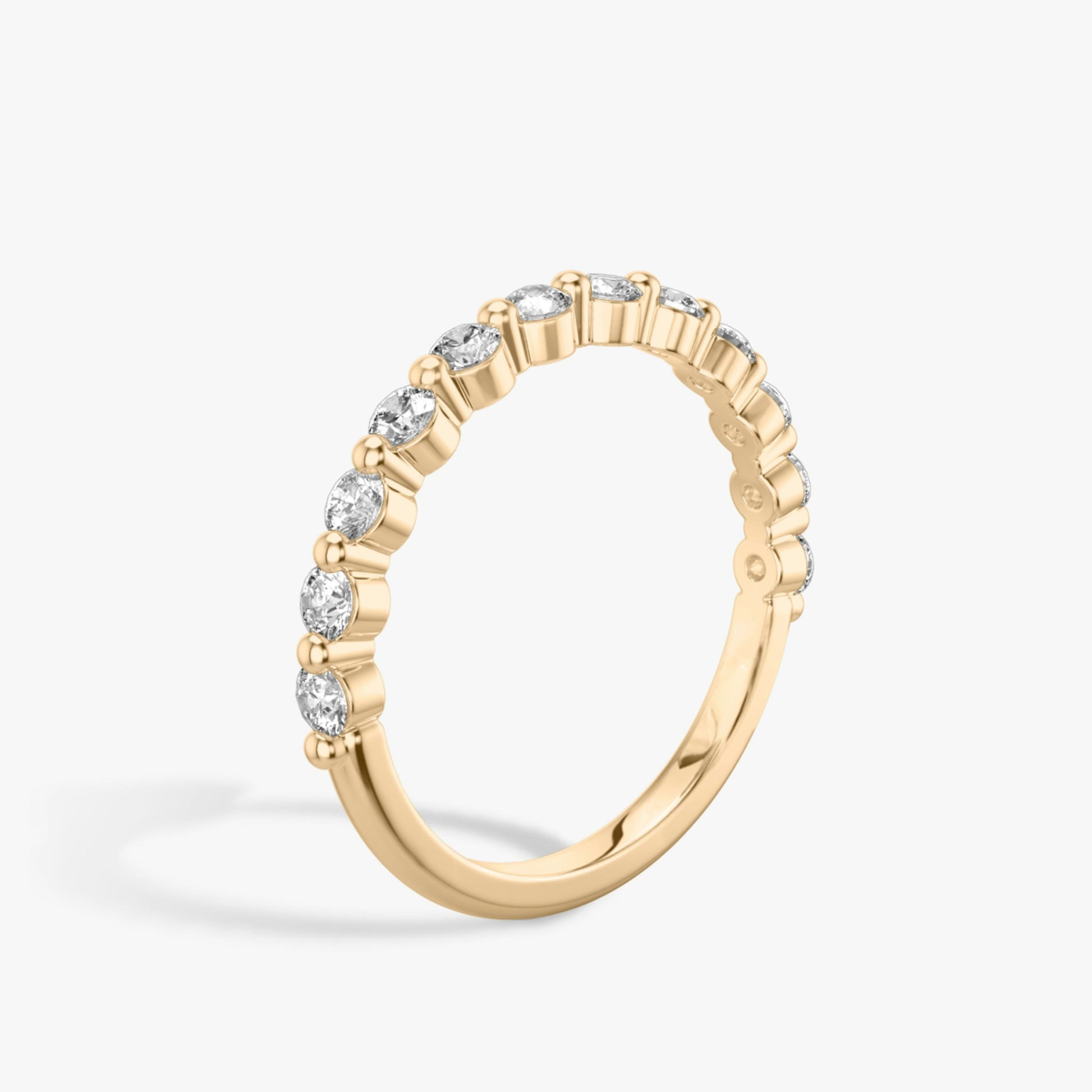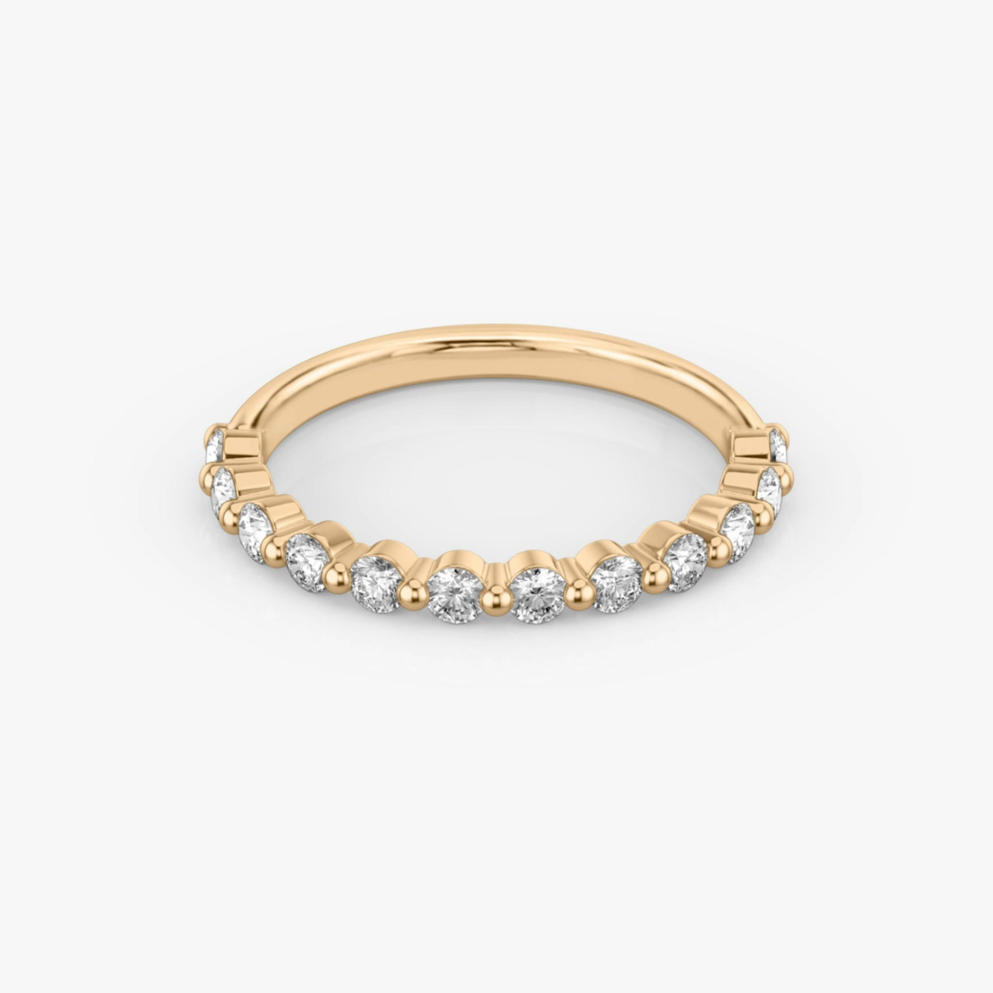 Presenting a diamond-centric reinterpretation of the classic wedding band. lab grown diamonds seem to levitate within a single shared-prong setting made of platinum or solid gold, offering an aura of otherworldly grace.