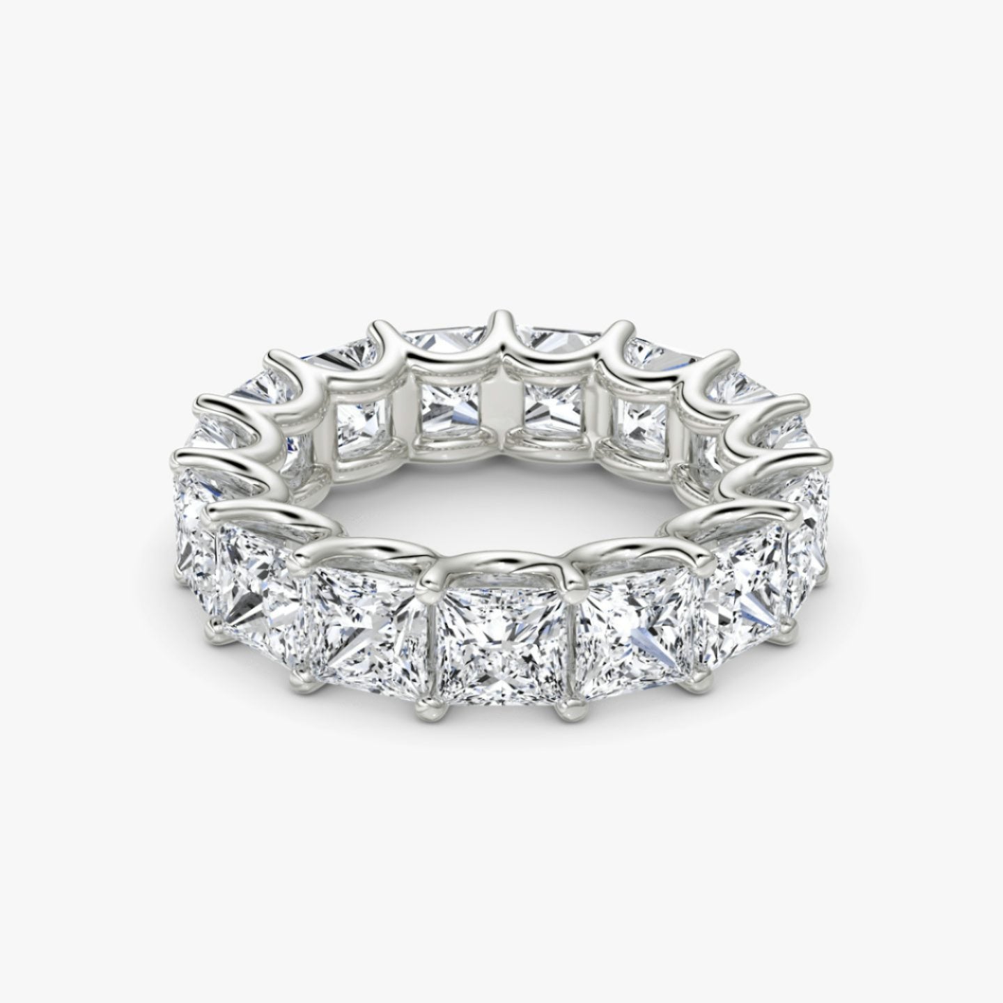 Boundless devotion. Our Eternity band captures the essence of your unwavering commitment with a band of platinum or solid gold, showcasing your selected shape of lab-grown diamonds. Its sleek u-prong setting is meticulously designed to maximize the light each diamond receives, ensuring a luminous display. Celebrate a lifelong love and unity with a wedding band crafted to endure through the ages. For the Emerald Shape, opt for either a half or full lab-grown diamond eternity band.